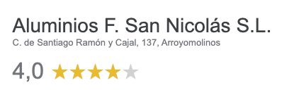 Aluminios F. San Nicolas, es una empresa de Madrid especializada en cerramientos, mediante estructuras metálicas de aluminio y vidrio. Aluminios F. San Nicolás lleva más de 35 años dedicado a la fabricación, montaje e instalación de carpintería de aluminio y buscando el mayor aislamiento acústico y térmico en lo que a cerramientos de aluminio se refiere.